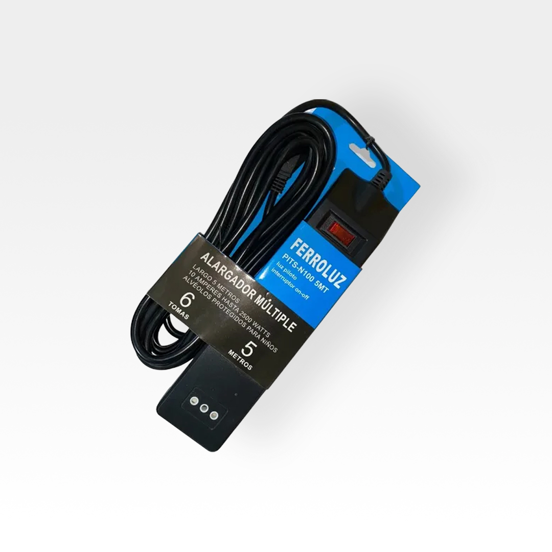 Alargador de alta resistencia con 6 enchufes protegidos y cable de 5 metros para mayor alcance en oficinas, talleres y hogares.